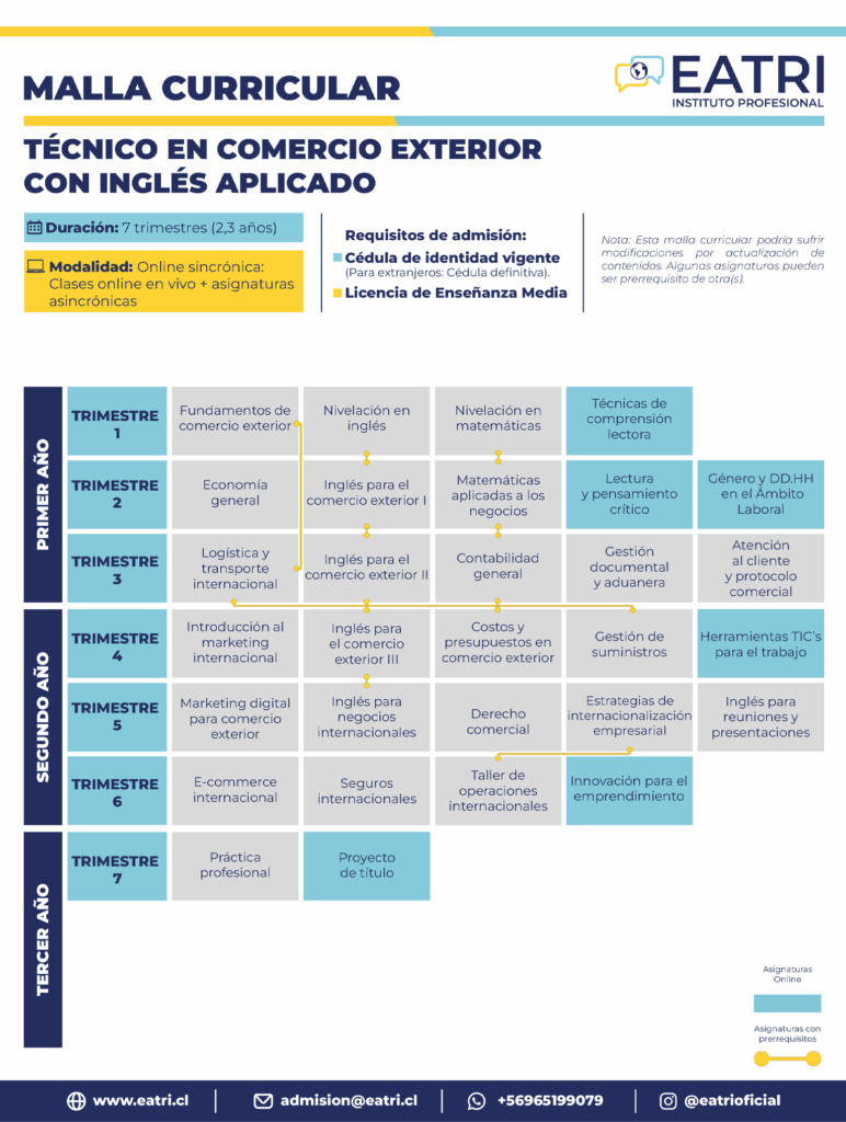 El(la) egresado(a) de la carrera Técnico en Comercio Exterior con Inglés Aplicado de EATRI está capacitado(a) para ejecutar y coordinar procesos técnicos de importación y exportación de bienes y servicios en empresas públicas y privadas, desempeñándose en un entorno dinámico del comercio exterior.